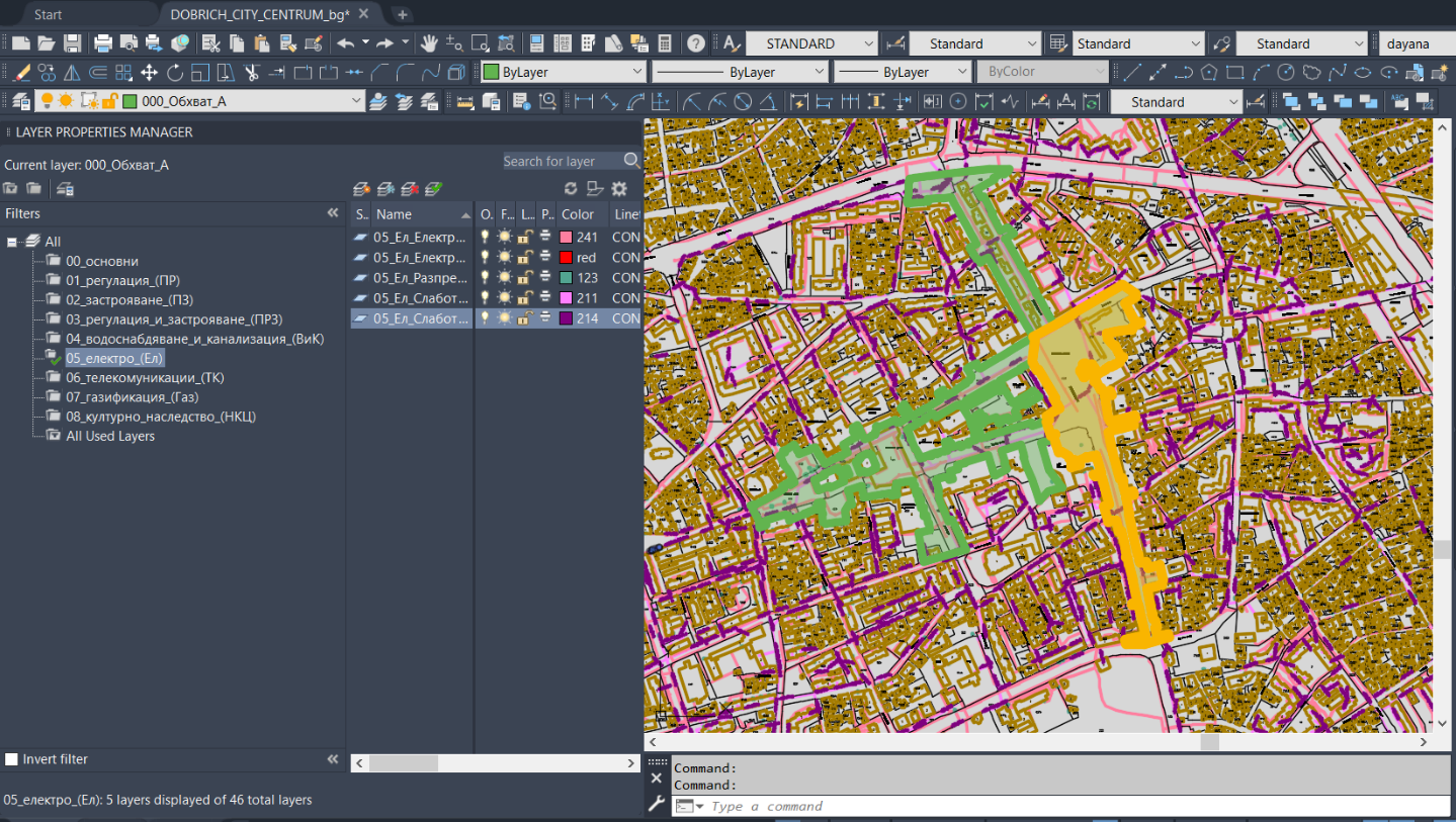 The attached dwg file includes all information provided by the Municipality of the City of Dobrich for the city center, including available data for underground infrastructure, etc.